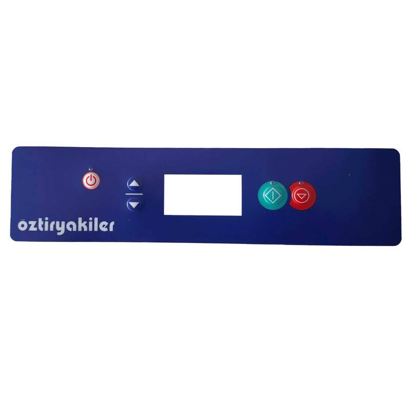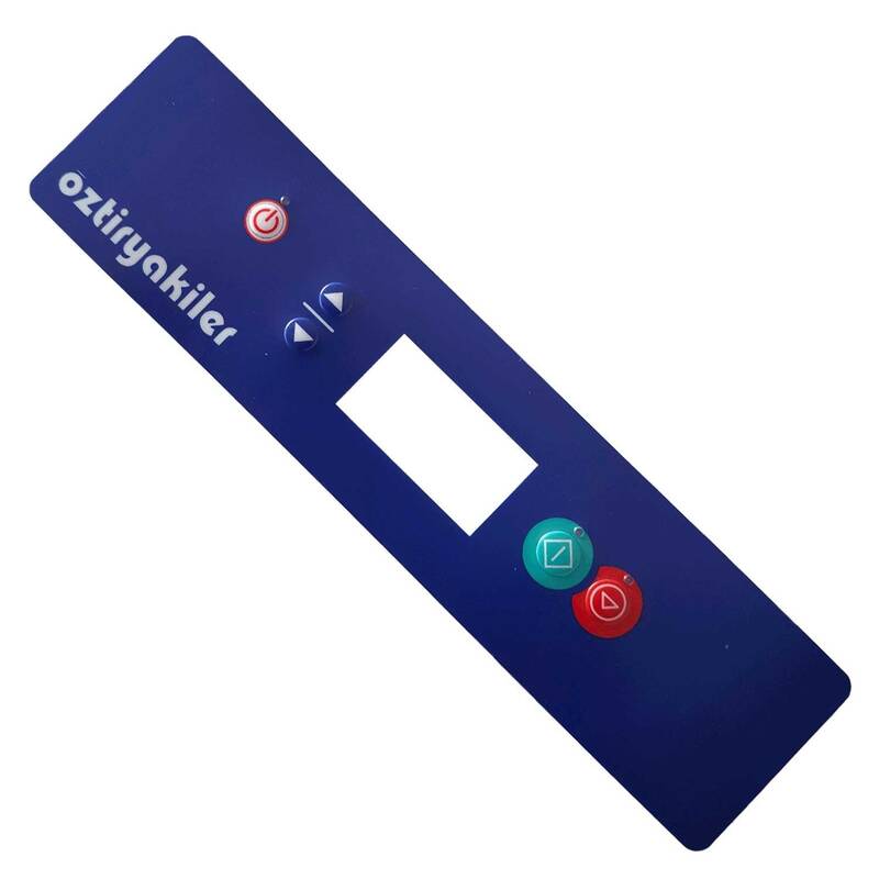 Öztiryakiler giyotin ve konveyörlü dijital bulaşık makineleri için ön panel etiketli tuş yüzeyi. 28,5x7 cm ölçülerinde, açma-kapama ve program seçme tuşları mevcut, dijital ekran kartı dahil değildir.